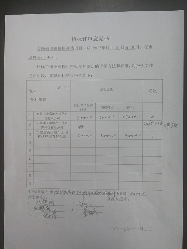 中標(biāo)候選人:安徽建英房地產(chǎn)土地資產(chǎn)評估有限公司(中標(biāo)價(jià)格:8000元)