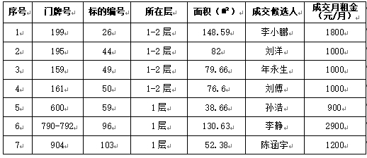 喜迎門小區(qū)部分商鋪公開競價招租工作已經(jīng)結(jié)束,成交候選人已經(jīng)確定?,F(xiàn)將競租結(jié)果公示如下: