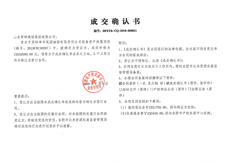 我公司委托合肥市產(chǎn)權(quán)交易中心采用網(wǎng)絡(luò)競價的方式對原蚌埠市花園油脂有限責(zé)任公司設(shè)備資產(chǎn)進(jìn)行公開處置。2018年6月21日發(fā)布公告,2018年7月5日確定了受讓方,2018年7月9日簽訂了《成交確認(rèn)書》?,F(xiàn)將具體情況公告如下: