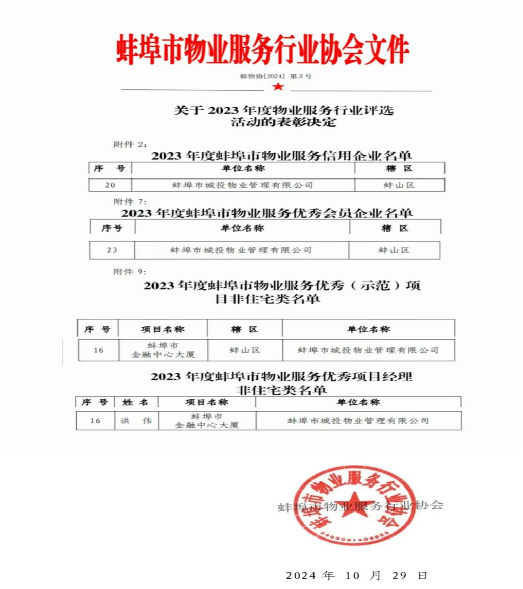 10月29日,城投物業(yè)公司在 2023 年度物業(yè)服務(wù)行業(yè)評選表彰活動中喜獲2023年度蚌埠市物業(yè)服務(wù)信用企業(yè)、2023年度蚌埠市物業(yè)服務(wù)優(yōu)秀會員企業(yè)、2023年度蚌埠市物業(yè)服務(wù)優(yōu)秀(示范)項目非住宅類、2023年度蚌埠市物業(yè)服務(wù)優(yōu)秀項目經(jīng)理非住宅類等四項榮譽稱號。